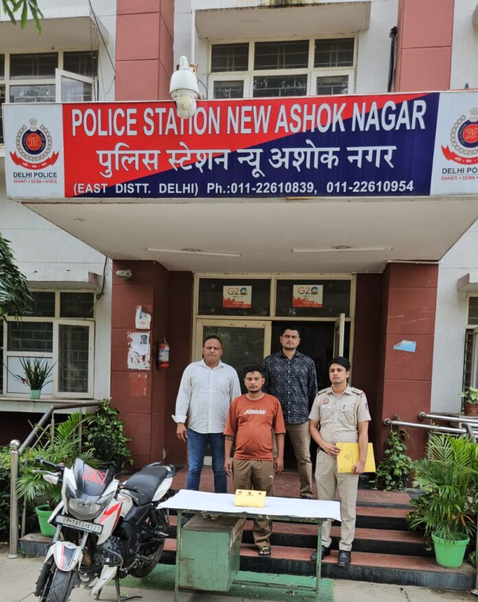 पूर्वी दिल्ली थाना न्यू अशोक नगर की पुलिस टीम ने रेहड़ीवाले से मारपीट कर मोबाइल और ₹4,000 लूटने वाले एक आदतन अपराधी निलेश चौहान (23 वर्ष), निवासी गांव बम्हेटा, गाज़ियाबाद, को गिरफ्तार कर लिया है। आरोपी ने सफेद रंग की टीवीएस अपाचे बाइक पर सवार होकर एक फर्जी बड़े ऑर्डर का लालच देकर वारदात को अंजाम दिया था। पुलिस ने तकनीकी निगरानी और 100 से अधिक सीसीटीवी कैमरों की जांच के बाद आरोपी को चिन्हित कर पकड़ा। वारदात में प्रयुक्त बाइक भी बरामद कर ली गई है।